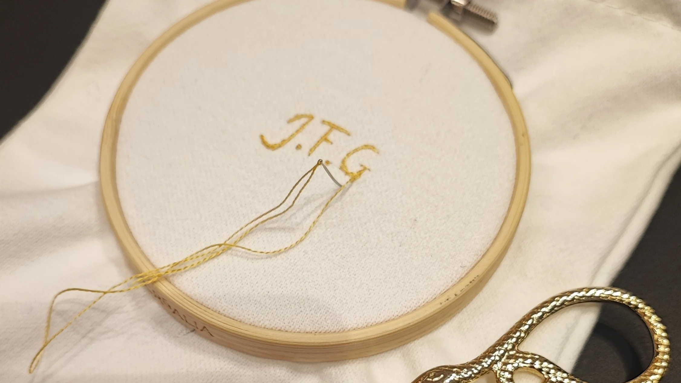 Personnalisation des pochettes Acqua Di Parma avec les initiales brodées des clients.es, pour la fête des Pères.