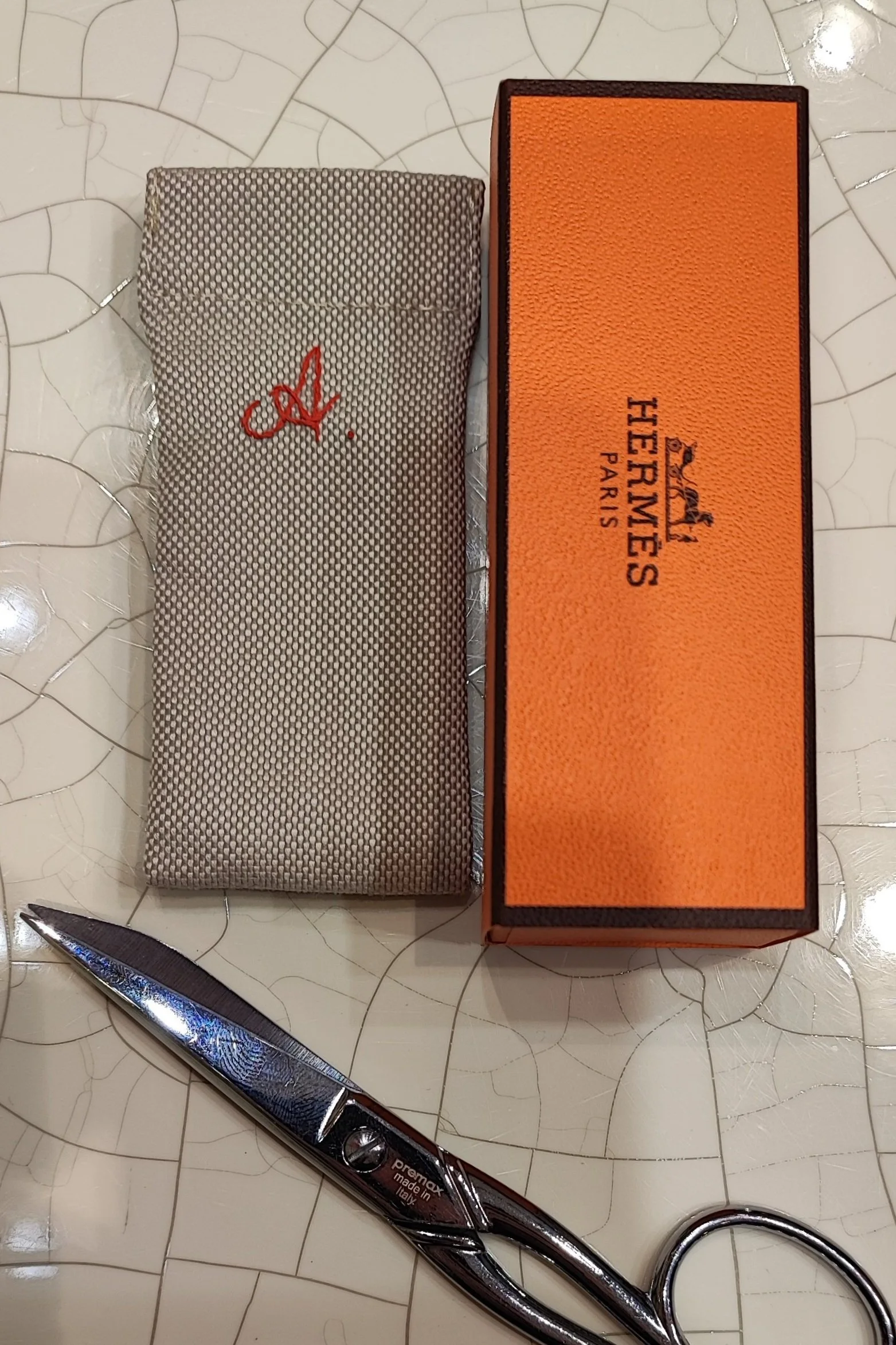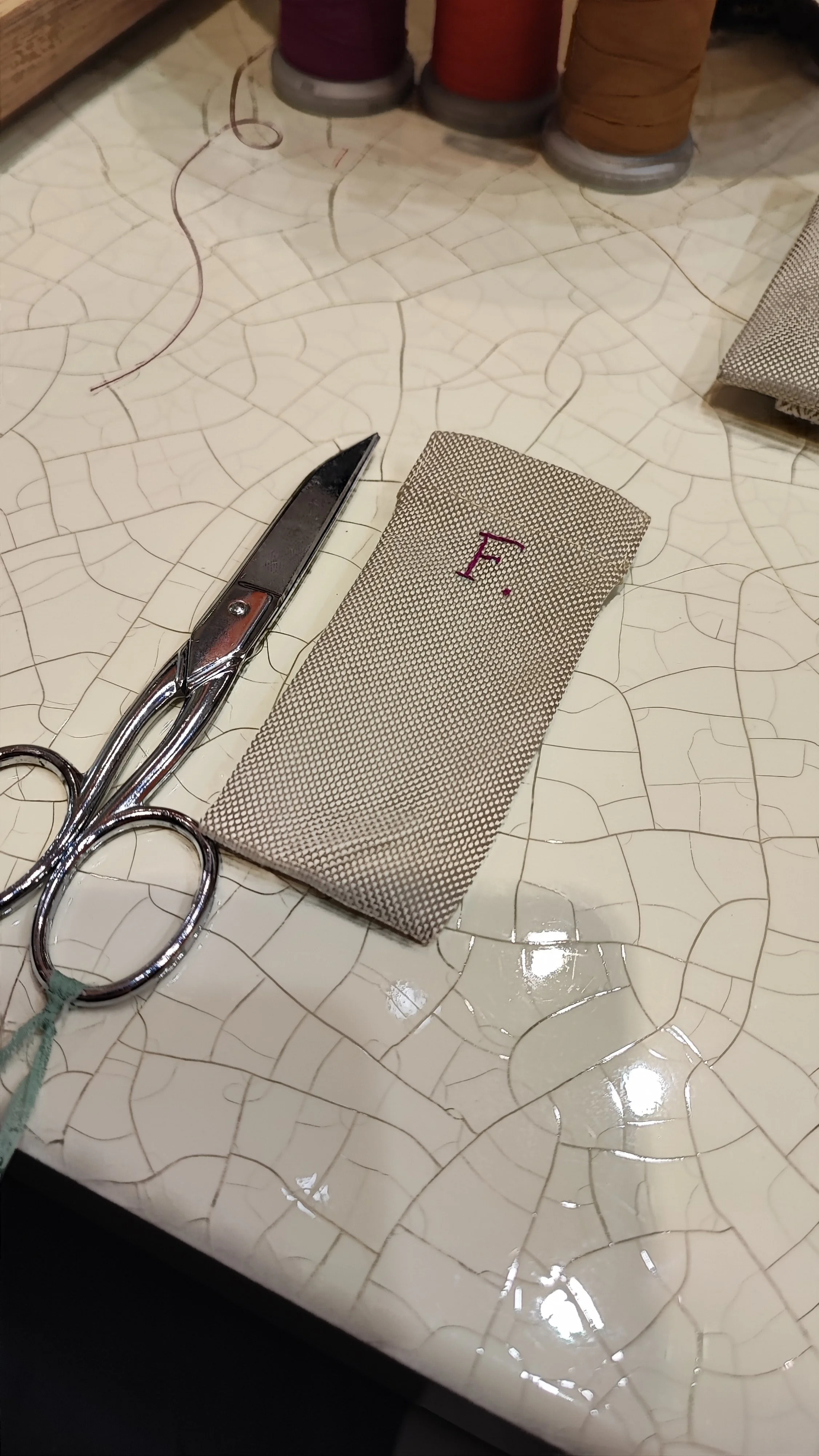 Personnalisation des pochettes Hermès cosmétiques avec les initiales brodées des clients.es.