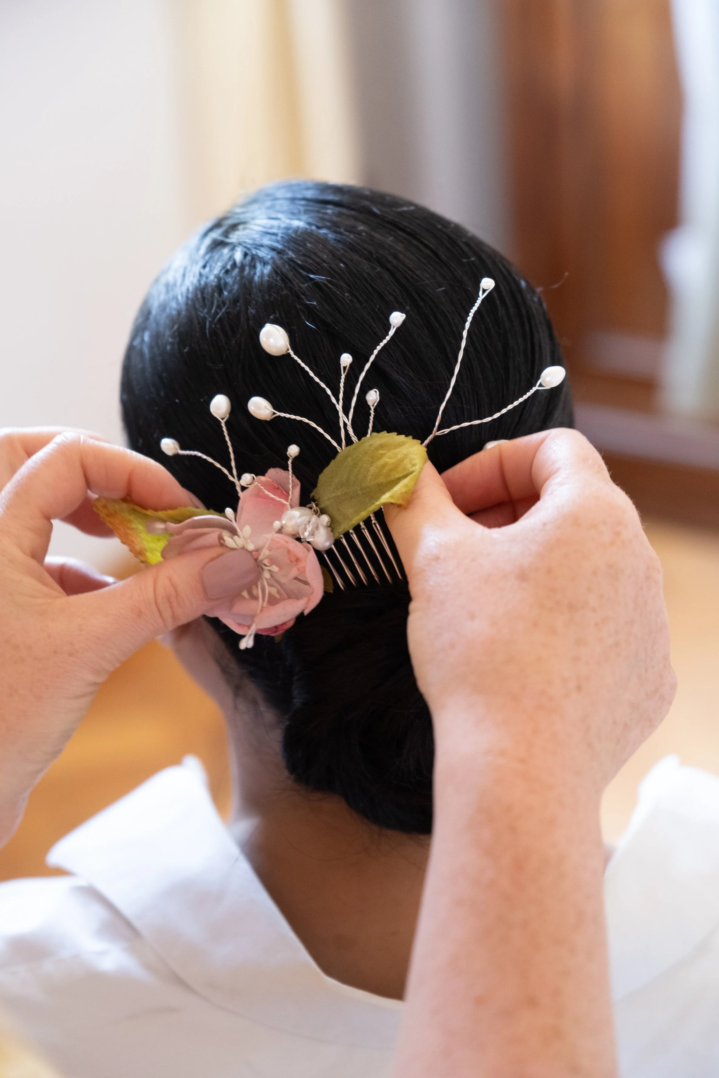 Réalisation des accessoires (voile, peigne, barrettes des témoins/demoiselles d’honneur) pour le mariage de Marine et Thibault.
